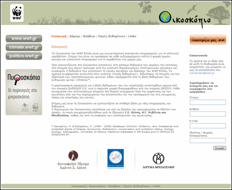 Ανοίγοντας το Οικοσκόπιο (www.oikoskopio.gr) ο επισκέπτης βλέπει μια αρχική οθόνη, όπου δίνεται μια σύντομη περιγραφή του περιεχομένου του, του σκοπού για τον οποίο σχεδιάστηκε, όπως και των χορηγών με τη βοήθειά των οποίων δημιουργήθηκε και εξελίχθηκε η συγκεκριμένη διαδικτυακή χαρτογραφική εφαρμογή. Απευθείας πρόσβαση στην ιστοσελίδα του WWF Ελλάς και στις στοχευμένες δράσεις της οργάνωσης, σε θέματα σχετικά με το κλίμα και την περιβαλλοντική πολιτική, δίνεται μέσω των συνδέσμων στα αριστερά της εισαγωγικής σελίδας. Εδώ θα βρείτε και εικονίδιο που οδηγεί στο Πυροσκόπιο (http://oikoskopio.gr/pyroskopio/), μια συγκεντρωτική βάση πληροφοριών για τις δασικές πυρκαγιές στην Ελλάδα.