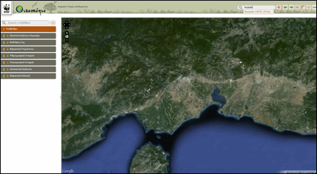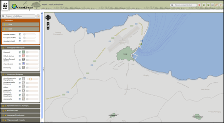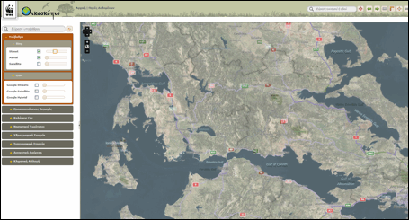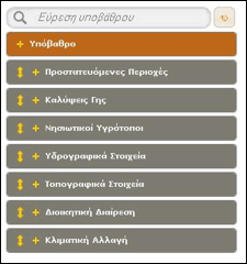 Στα αριστερά, η αναδιπλούμενη λίστα επιλογών βασικού υποβάθρου και θεματικών επιπέδων πληροφορίας. Μία γραμμή αναζήτησης προσφέρεται για την πληκτρολόγηση και γρήγορη εύρεση (χωρίς περιήγηση στις αναδιπλούμενες λίστες) του τίτλου του υποβάθρου ή του θεματικού επιπέδου το οποίο επιθυμεί να επιλέξει και να προβάλει στο χάρτη ο επισκέπτης.