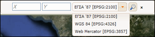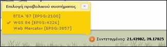 · Κάτω και δεξιά, οι ακριβείς συντεταγμένες του σημείου που δείχνει σε κάθε μετακίνησή του ο κέρσορας στον χάρτη. Ο χρήστης του Οικοσκοπίου μπορεί να επιλέξει μεταξύ τριών ευρέως χρησιμοποιούμενων προβολικών συστημάτων, με δυνατότητα εναλλαγής από το ένα στο άλλο.