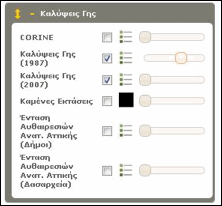 Η κατηγορία Καλύψεις γης στην αναδιπλούμενη λίστα επιλογών στα αριστερά του χάρτη περιλαμβάνει τις χρήσεις γης κατά CORINE 2000, καθώς και τις καλύψεις γης τα έτη 1987 και 2007, όπως έχουν προκύψει από τη χαρτογράφηση που εκπόνησε το Εργαστήριο Δασικής Διαχειριστικής και Τηλεπισκόπησης του ΑΠΘ και το WWF Ελλάς. Στην ίδια κατηγορία μπορεί κανείς να δει και τις μεγαλύτερες καμένες εκτάσεις της Ελλάδας από το 2007 έως σήμερα.