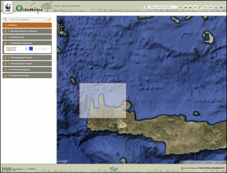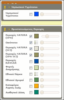 Για την εμφάνιση της πληροφορίας (Προστατευόμενες Περιοχές, Καλύψεις Γης, Νησιωτικοί Υγρότοποι, Υδρογραφικά Στοιχεία, Τοπογραφικά Στοιχεία, Διοικητική Διαίρεση, Κλιματική Αλλαγή)στο χάρτη, ο επισκέπτης μπορεί να αναπτύξει τις διαθέσιμες λίστες (με ένα κλικ στον τίτλο της θεματικής ενότητας ή στο σύμβολο «+») και να επιλέξει με τον τρόπο που περιγράφηκε οποιαδήποτε από τα επιμέρους επίπεδα έχοντας για όλα τις ίδιες δυνατότητες με τα βασικά υπόβαθρα όπως: έλεγχο ποσοστού διαφάνειας, αλλαγή στη σειρά εμφάνισης μεταξύ των επιπέδων κάθε θεματικής ενότητας, αλλά και μεταξύ διαφορετικών θεματικών ενοτήτων, με σύρσιμο και μετακίνηση (drag & drop) μέσα στην ίδια θεματική ενότητα.