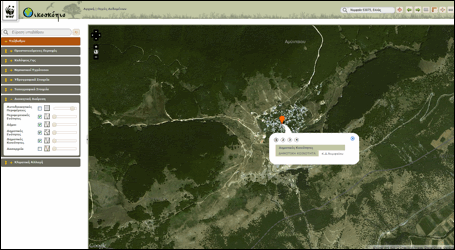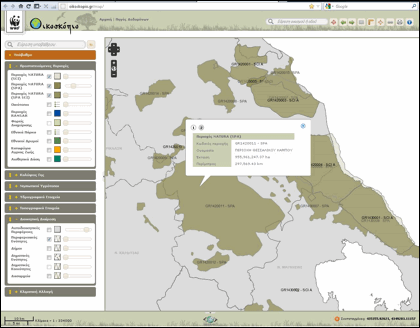 Στην εικόνα που φαίνεται παρακάτω απενεργοποιήθηκε από την αναδιπλούμενη λίστα στα αριστερά το βασικό υπόβαθρο του Google και επιλέχθηκαν α) οι Περιφερειακές Ενότητες (νομοί) από το θεματικό επίπεδο Διοικητική Διαίρεση και β) οι τρεις κατηγορίες περιοχών του δικτύου Natura 2000 (SCI, SPA, SCI/SPA)από το θεματικό επίπεδο Προστατευόμενες Περιοχές. Ενδεικτικά ο χάρτης εστιάστηκε στο νομό Λάρισας και κατόπιν ζητήθηκαν οι σχετικές περιγραφικές πληροφορίες (αριστερό κλικ σε συγκεκριμένη περιοχή ενδιαφέροντος).