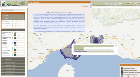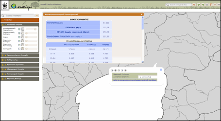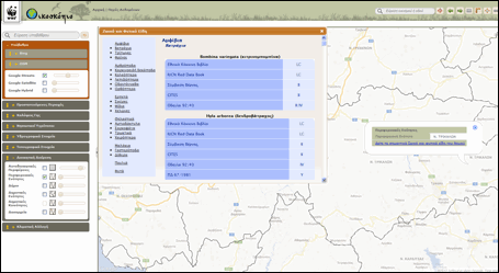 Η πληροφορία για τα απειλούμενα και προστατευόμενα είδη εμφανίζεται περιγραφικά, έχοντας προηγουμένως ενεργοποιήσει το επίπεδο Περιφερειακές Ενότητες (Νομοί) και εστιάσει σε συγκεκριμένη περιοχή του χάρτη, όπως φαίνεται στο παράδειγμα της εικόνας.