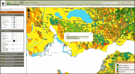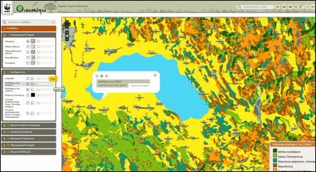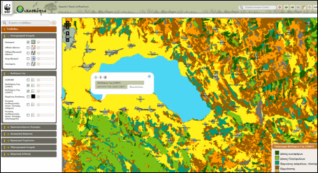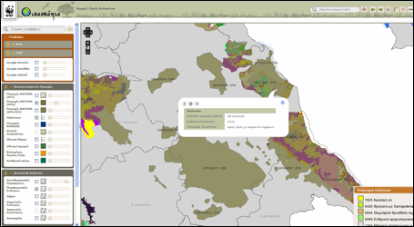 Κρατώντας τις βασικές πληροφορίες ενεργοποιημένες από την προηγούμενη αναζήτηση, στο συγκεκριμένο παράδειγμα επιλέχθηκαν επιπλέον οι Οικότοποι από τις Προστατευόμενες περιοχές, επίπεδο πληροφορίας που συγκεντρώνει τη χαρτογράφηση της πλειονότητας των οικότοπων κοινοτικής σημασίας εντός των Τόπων Κοινοτικής Σημασίας (Special Areas of Conservation). Με αριστερό κλικ στην περιοχή ενδιαφέροντος, ανοίγει ο πίνακας περιγραφικών πληροφοριών με τις κατηγορίες των οικότοπων (κωδικός περιοχής Natura, κωδικός οικοτόπου και ονομασία οικοτόπου) που έχουν χαρτογραφηθεί στην εν’ λόγω περιοχή. Στο βοηθητικό χρωματικό υπόμνημα, που ανοίγει αυτόματα με την ενεργοποίηση της συγκεκριμένου επιπέδου, εμφανίζονται οι συχνότεροι οικότοποι καθώς και οι οικότοποι προτεραιότητας. Οι υπόλοιποι δεν απεικονίζονται με διαφορετικό χρώμα, εμφανίζεται ωστόσο η σχετική πληροφορία (κωδικός περιοχής Natura, κωδικός οικοτόπου και ονομασία οικοτόπου) Η χαρτογράφηση των οικότοπων (πηγή ΥΠΕΚΑ) δεν είναι διαθέσιμη για τις Ζώνες Ειδικής Προστασίας που εντάχθηκαν πρόσφατα στο Δίκτυο Natura 2000.